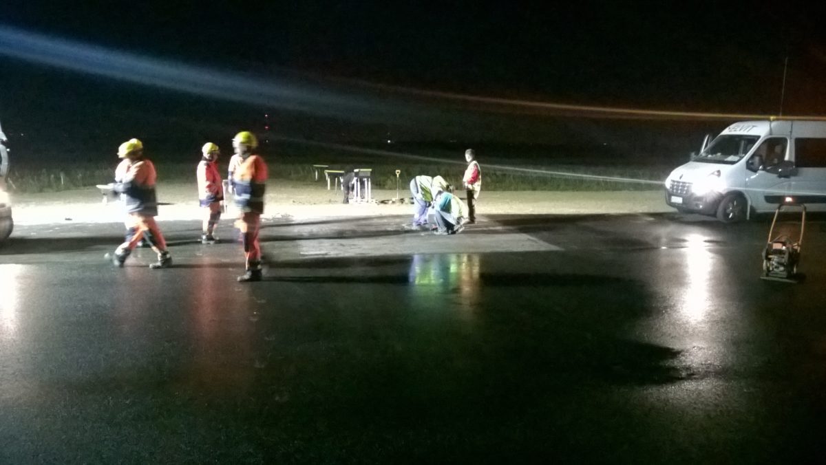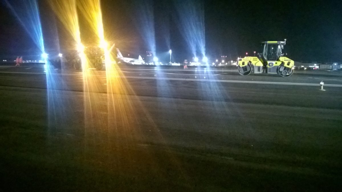 Prace wykonywane pod ciągłą eksploatacją pasa (lotnisko nie było zamknięte w czasie prowadzenia prac, a prace należało prowadzić w sposób umożliwiający starty i lądowania samolotów). Większość prac, ze względu na zmniejszony ruch lotniskowy, wykonywano w nocy co było dodatkowym utrudnieniem w przypadku obsługi geodezyjnej. Do najtrudniejszych zadań geodezyjnych należało wytycznie, z bardzo dużą dokładnością, pozycji oraz kierunku świateł nawigacyjnych montowanych na pasie startowym.